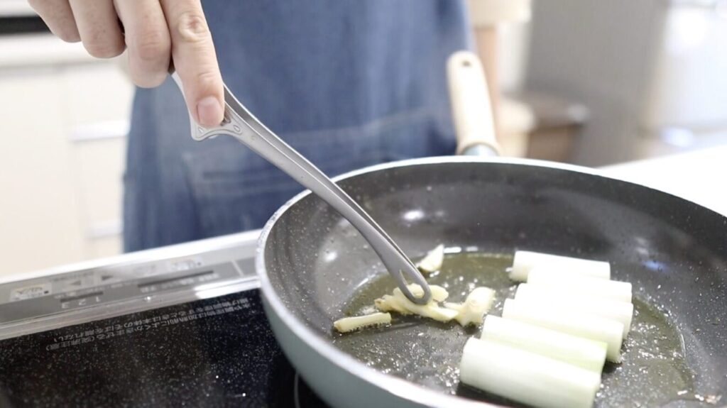 ④フライパンにニンニク、長ネギを入れ弱火でキツネ色になったら一旦取り出します