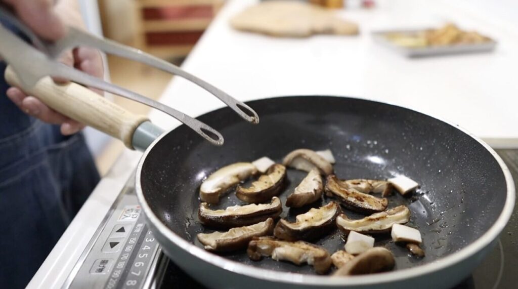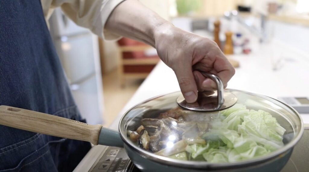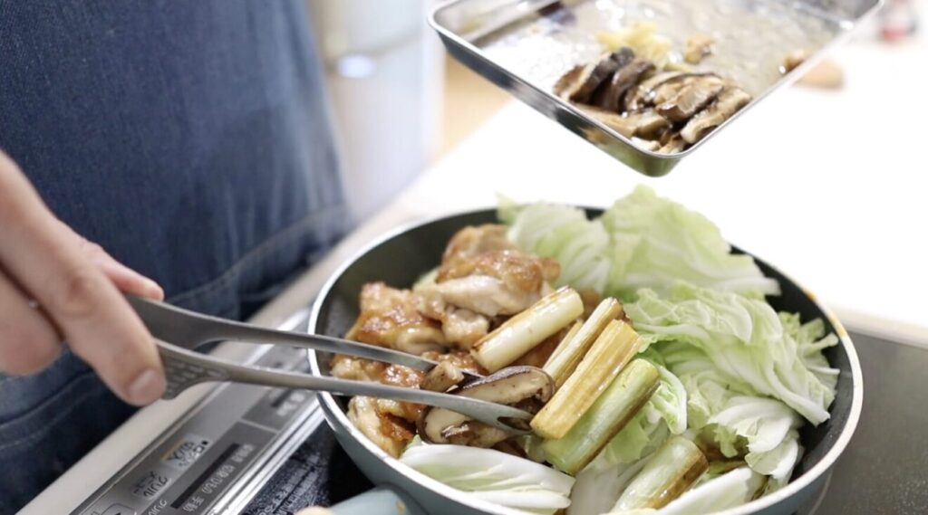 ⑦フライパンに白菜、ネギ、しいたけ、にんにく、鶏もも肉を入れ中火にかけます