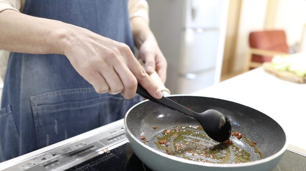 ⑥フライパンに豆板醤を入れ中火で香りが出るまで炒め