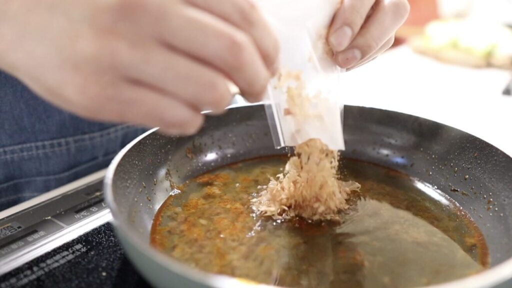 水、塩を入れ混ぜ合わせ、鰹節を入れたら火を止めます