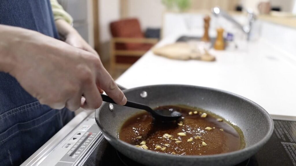 ①フライパンに醤油・みりん・中濃ソース・カレー粉・潰したにんにくを粗みじんにし火にかけます