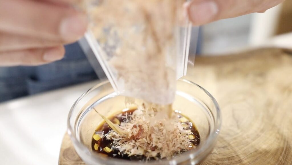 ②沸騰したら1分煮詰め、ボウルに移してかつお節を加えて混ぜます