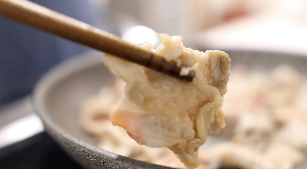 ④豚バラ肉を食べやすい大きさにカットし、醤油をふりかけて軽くなじませます