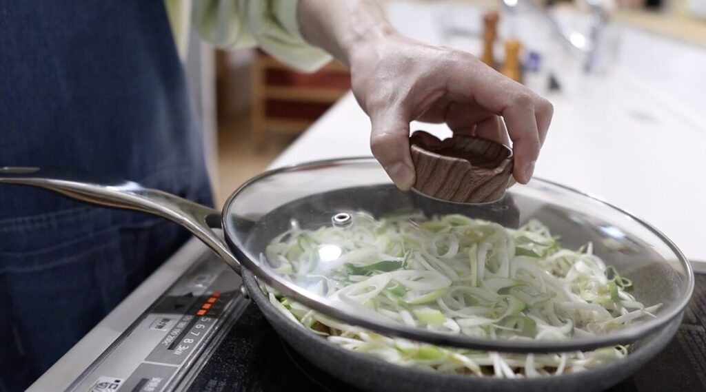 ⑥もやしと長ネギを加え、酒を回し入れて蓋をし2分蒸します