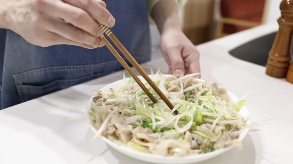 ⑩自家製タレを回しかけ、全体をさっと混ぜ合わせます。