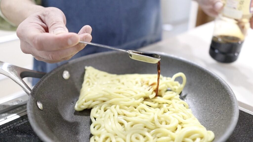 ❍麺に先に醤油をふると香りが移り、タレとの一体感が生まれます。焼き色がつくと麺がほぐれやすくなります