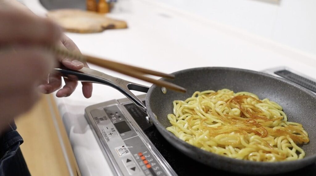 ⑧フライパンに油を引き、焼きそば麺を入れて醤油をふりかけます。
