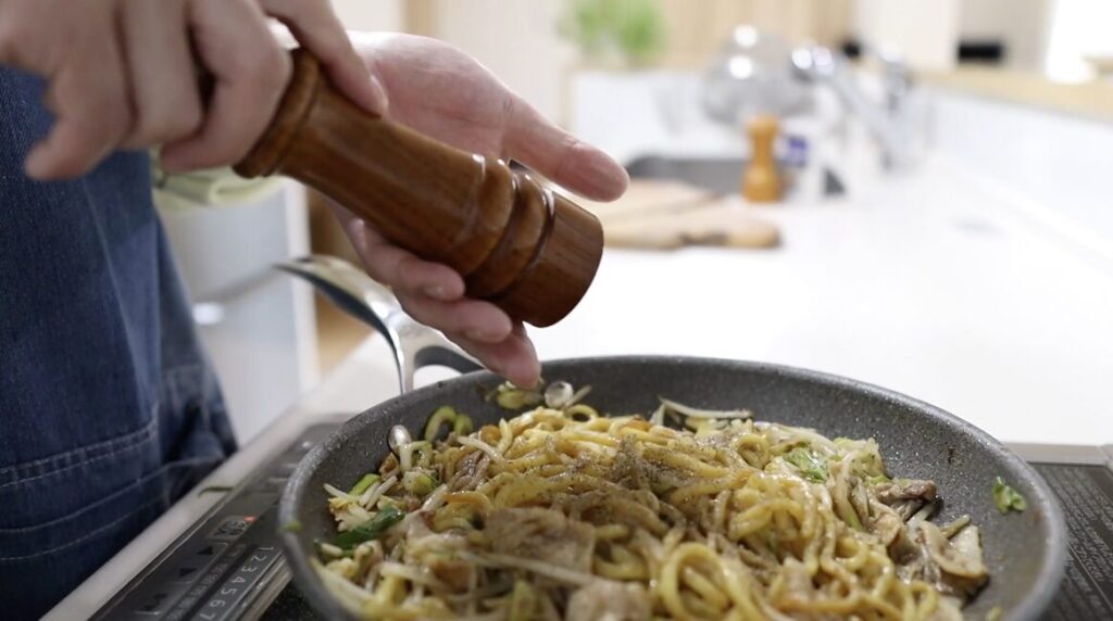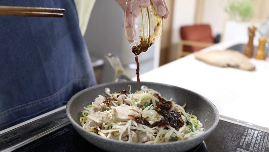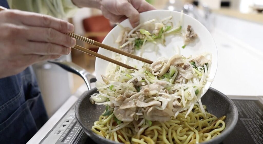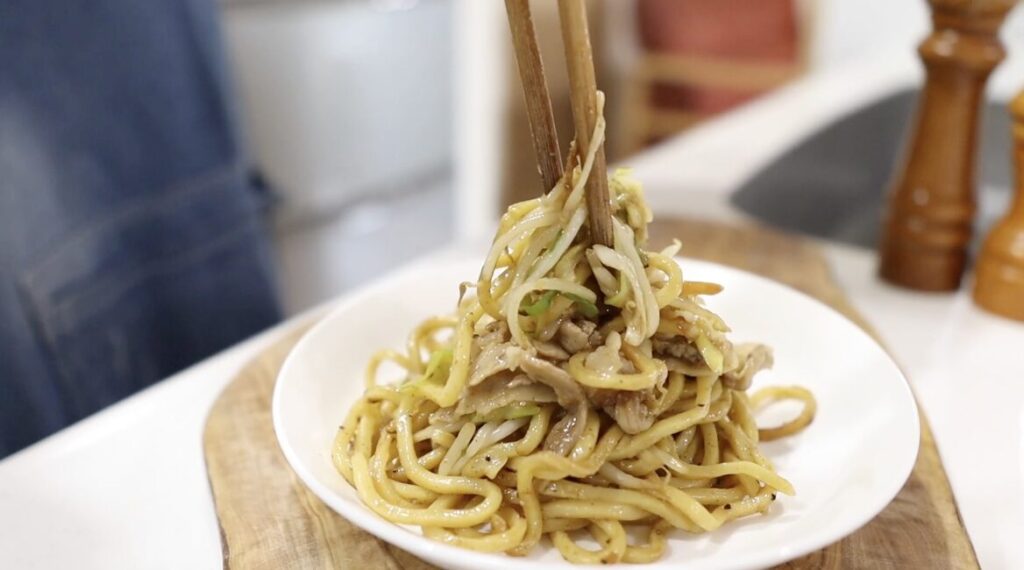麺を先に醤油で焼くことで香ばしさと一体感が生まれ、蒸し焼きにした肉と野菜はシャキシャキ・ふっくらした仕上がりになります。