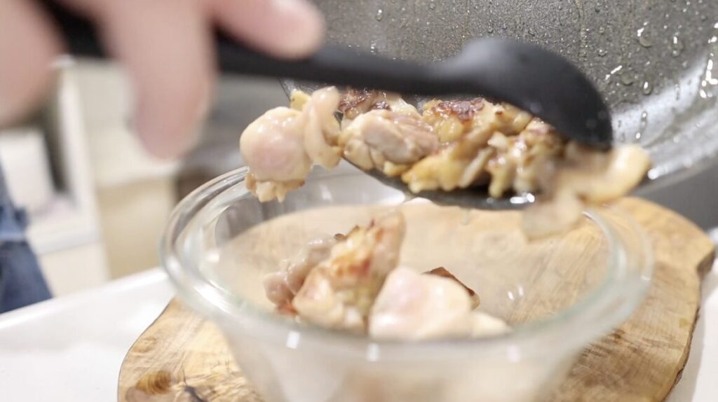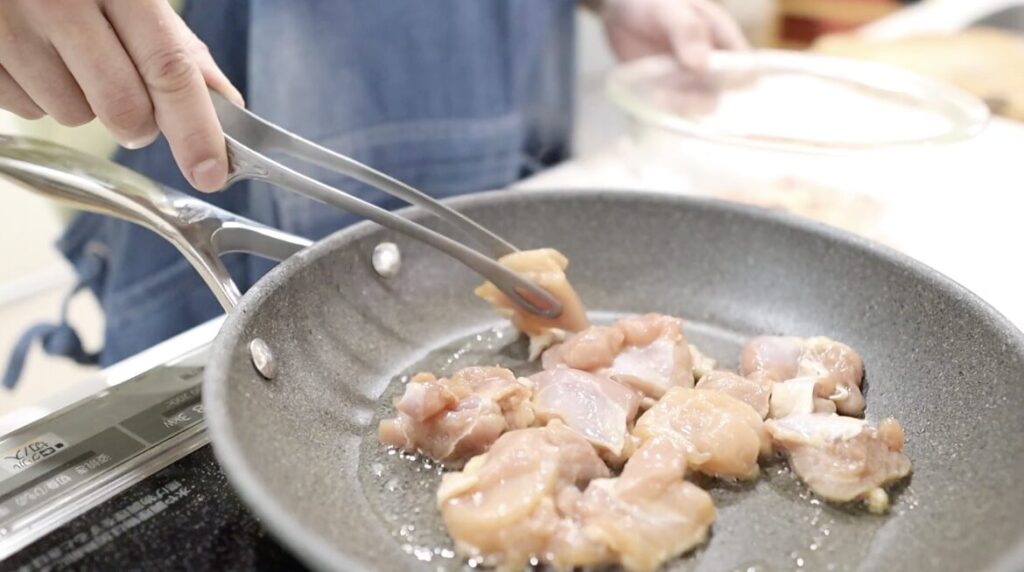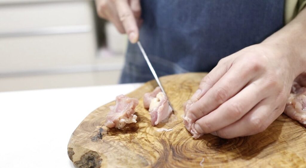 ①鶏もも肉を一口にカットします