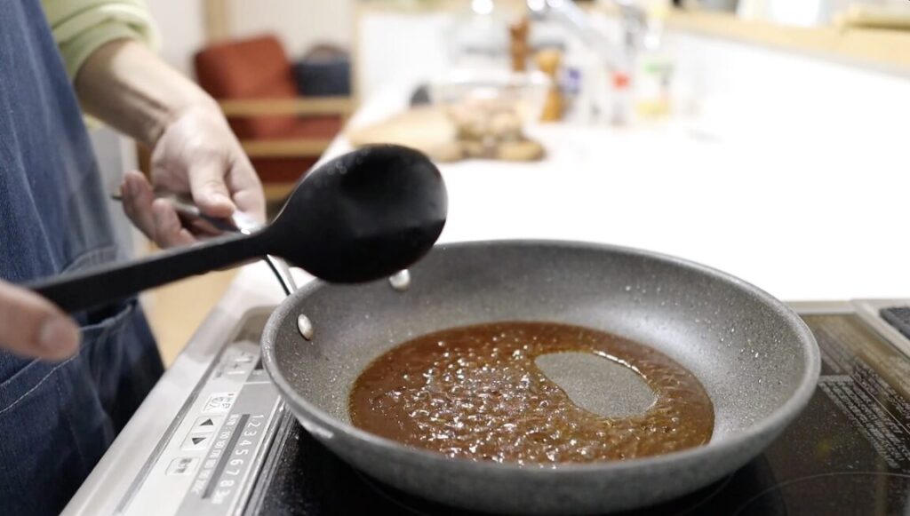 ⑤フライパンに調味料を入れ、中火にかけ沸騰したら2分煮詰めます