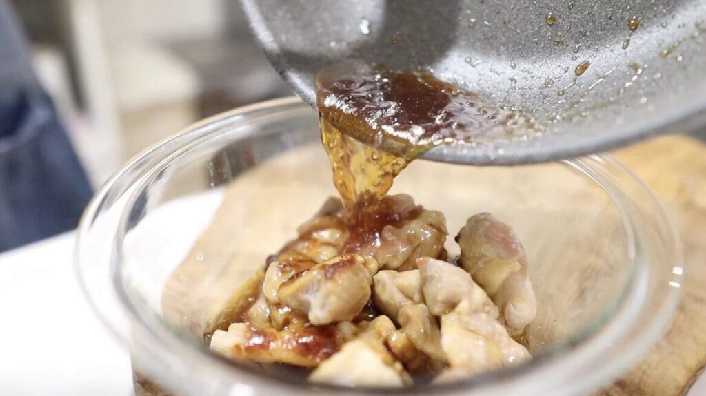 ⑥煮詰めたタレを、肉の入ったボールに入れ混ぜ合わせます