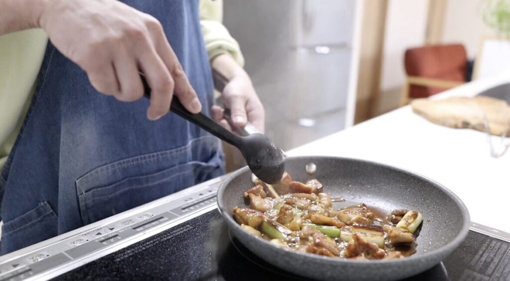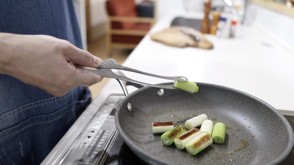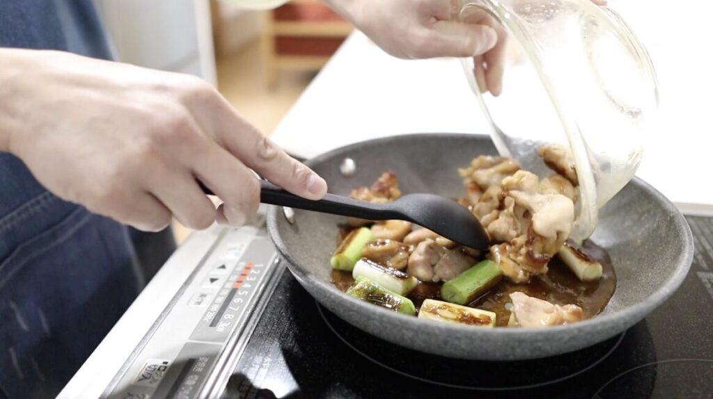 ⑧中火にしネギを焼きます。両面に焼色がついたら、肉、タレを入れます